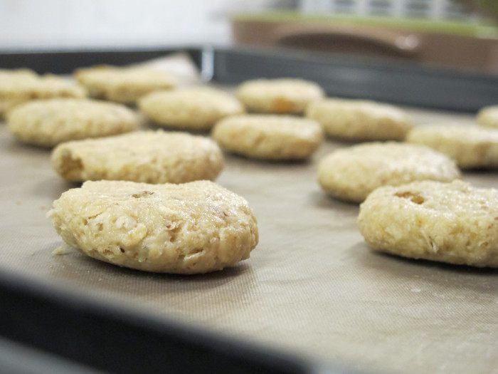 Сформировать из теста шарики, слегка приплюснуть и выложить их на противень на расстоянии друг от друга.