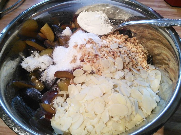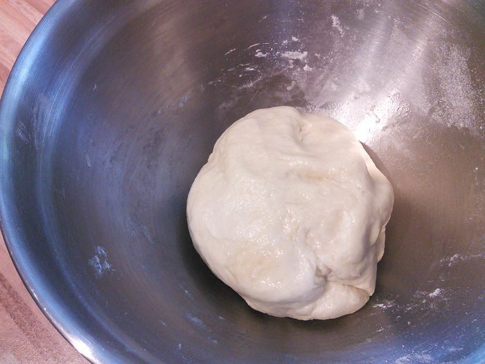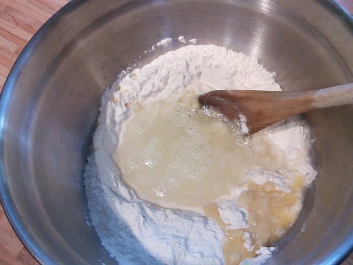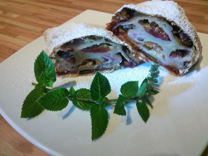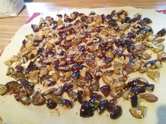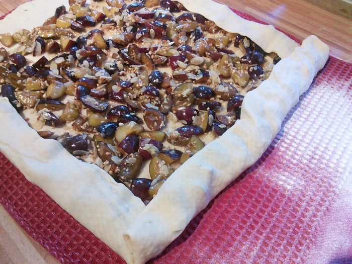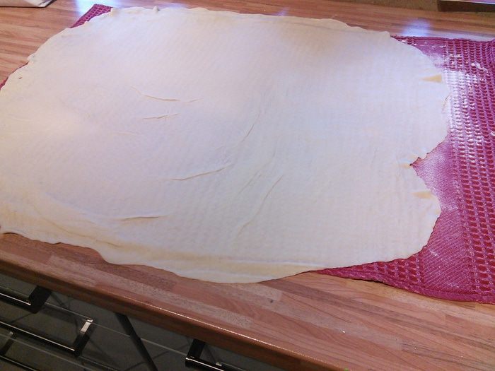 Завернуть концы, затем с помощью полотенца закрутить в рулет. Все получается очень легко, без проблем. Рулет переложить швом вниз на противень, выложенный пергаментом, смазать желтком и запекать в предварительно разогретой до 175° духовке примерно 45 мин.