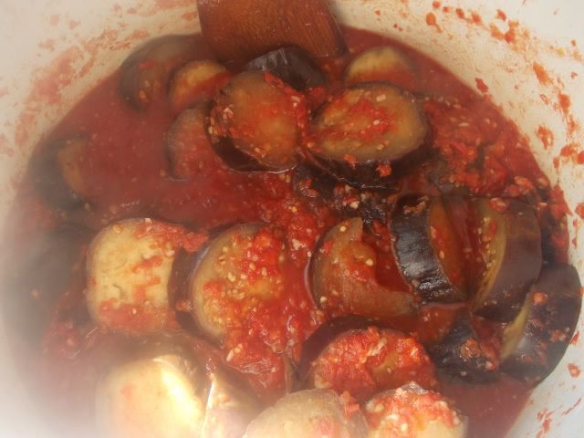 Когда баклажаны потушатся,добавим соль,уксус и сахар,проварим еще 5 минут.