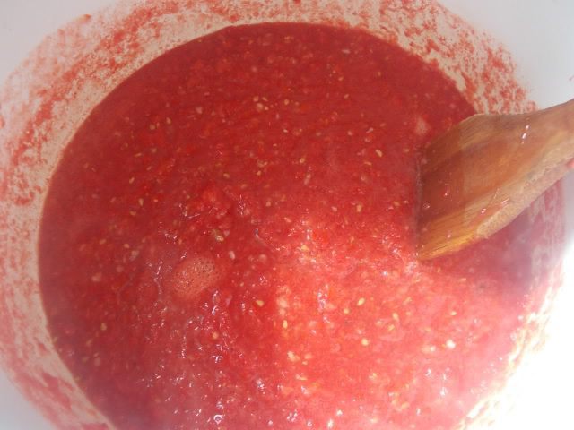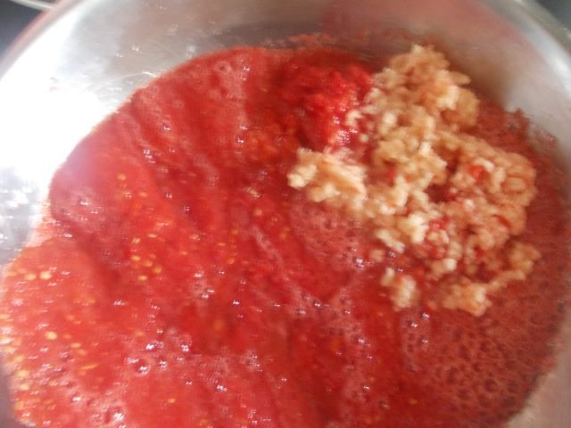 Помидоры помолоть вместе с чесноком и поставить на огонь.