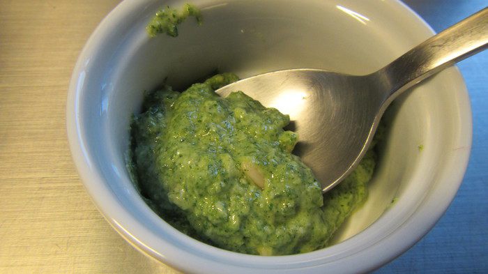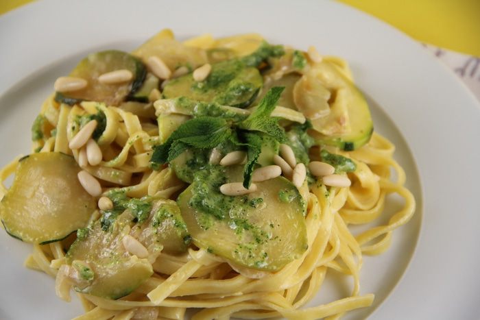 Приготовим песто. Мяту моем и обсушиваем. Разделяем ее на небольшие веточки. Взбиваем ее с пармезаном и кедровыми орехами в однородную массу. Не выключая мотор, добавляем масло и лимонный сок. Солим, перчим по вкусу.
