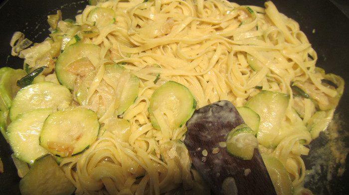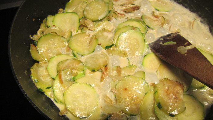 Лук режем полукольцами, чеснок измельчаем. В сковороде разогреваем масло и обжариваем, помешивая, лук, чеснок и кабачки 12 минут. Добавляем сливки и готовим еще несколько минут (или пока сливки слегка уварятся).