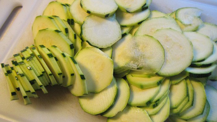 Цукини режем тонкими кружочками.
