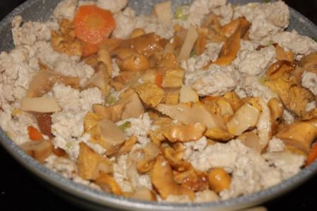 Добавить масло и соль, тщательно размешать, добавить 2 вида муки, замесить тесто. Тесто отправить в холодильник, пока готовим начинку.