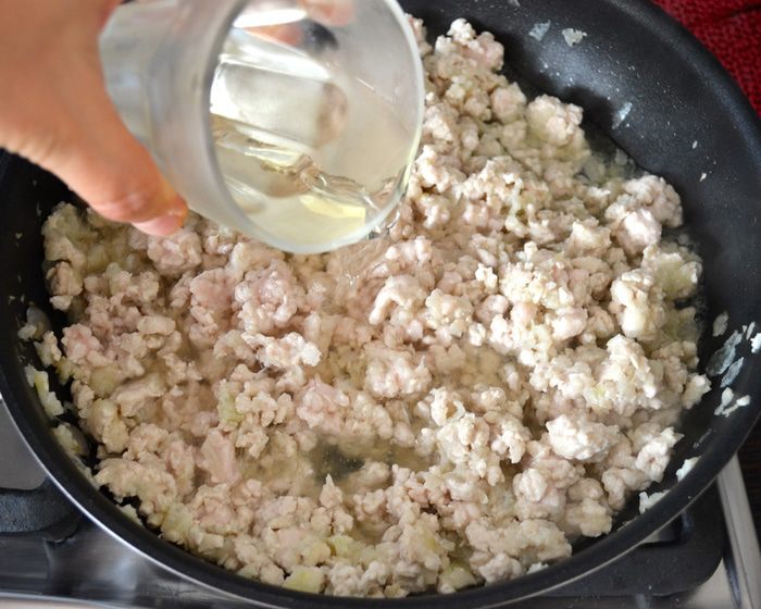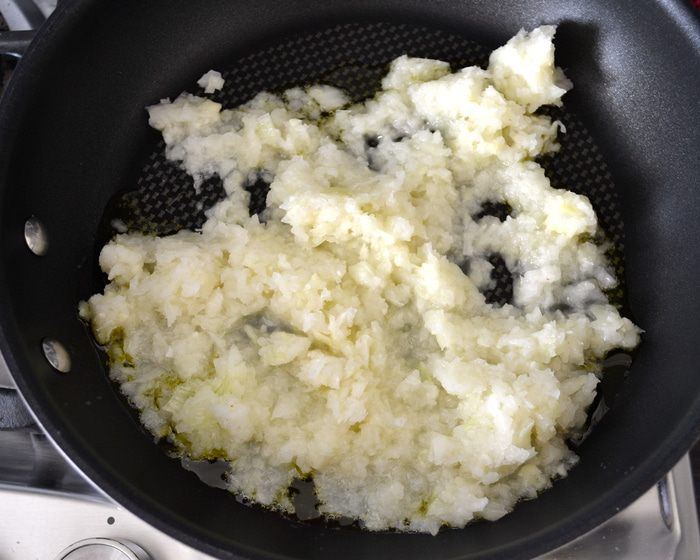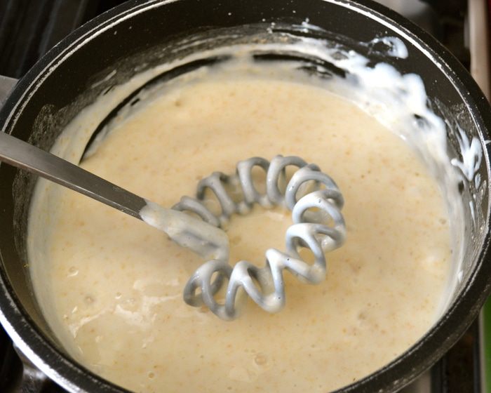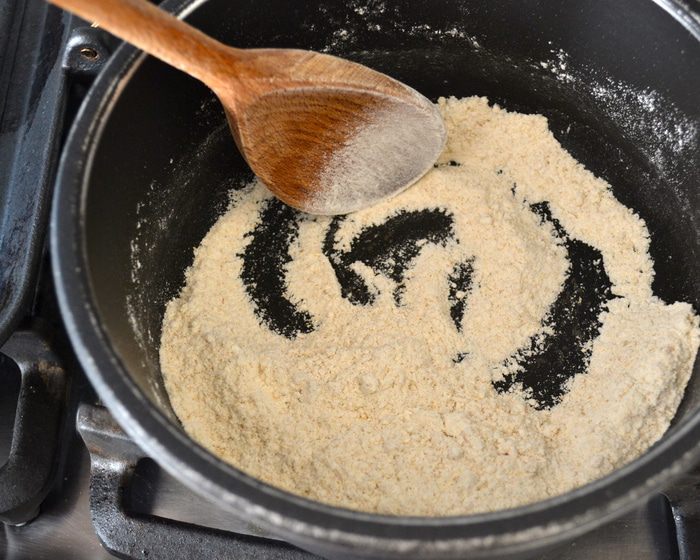 Тем временем приготовить соус бешамель. ТАКИМ образом я готовила соус впервые! Понравился! Думаю, что и в будущем буду использовать этот рецепт... ))) Итак, в небольшую кастрюльку положить цельнозерновую муку и, не добавляя жиров (!), постоянно помешивая, обжарить на огне около 1-2 минут.