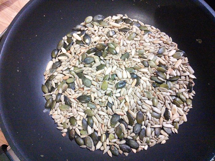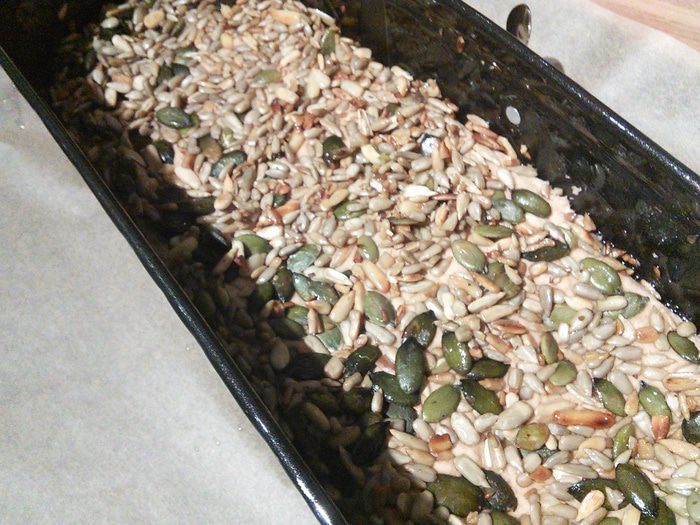Семечки ( у меня микс) поджарить на горячей сковороде и горячими выложить на тесто, накрыть горячим влажным полотенцем и отправить на 45 мин. в тёплую духовку.