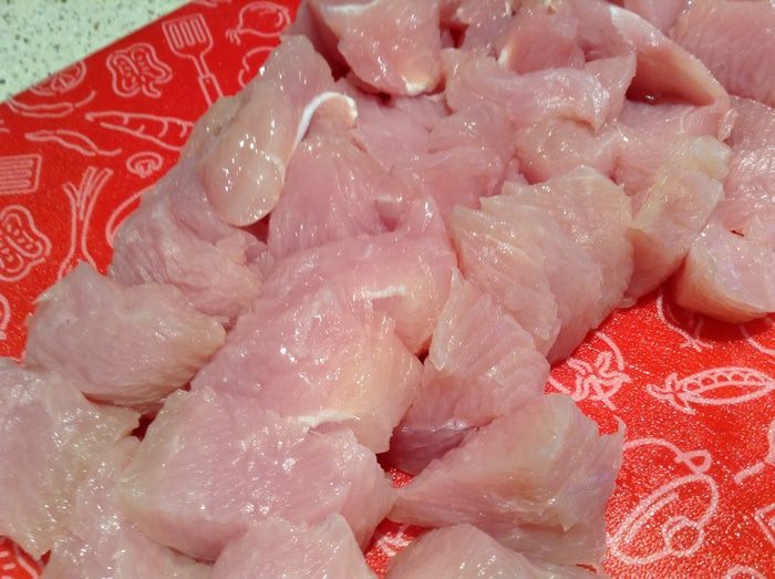 Филе вымыть, подсушить и нарезать на кусочки.