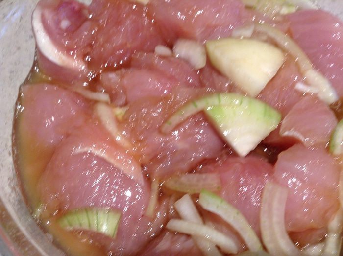 К филе добавить лук, чеснок, соевый соус и ананасовый сироп (из консервированных ананасов). Оставить на 30 минут.