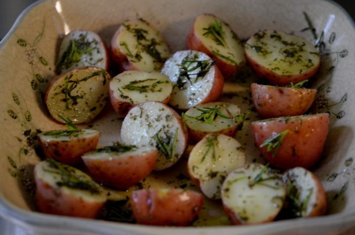 Выложить все травы и соль с перцем на это блюдо. Каждый картофель обвалять в нем. Поставить в разогретую духовку и готовить 20-30 мин.или до готовности.