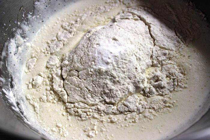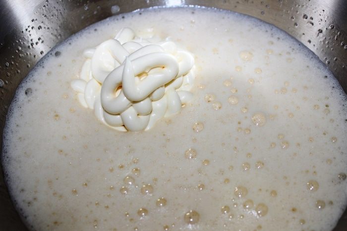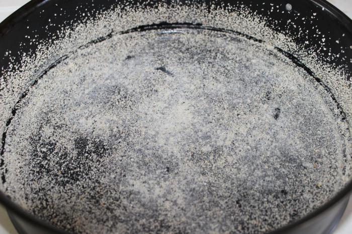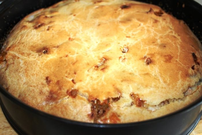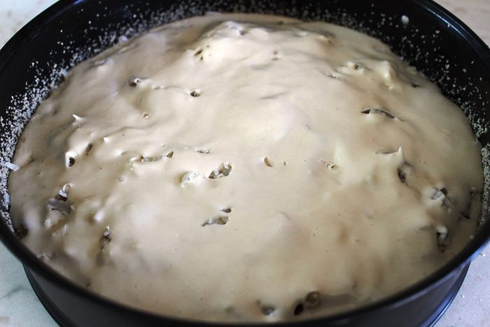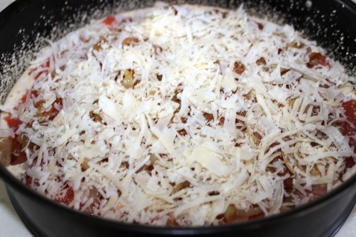 Осторожно вылить на дно 2/3 части теста и ровно распределить его. Поверх теста выложить кусочки рыбы (по-одному, от центра к краю). На рыбу разложить лук. Присыпать солью, перцем и свеженатертым мускатным орехом. Много солить не нужно, поскольку тесто с майонезом, в нем достаточно соли.