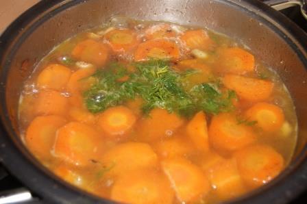 Добавить укроп и воду, так чтобы она только покрывала морковь, варить до готовности моркови.