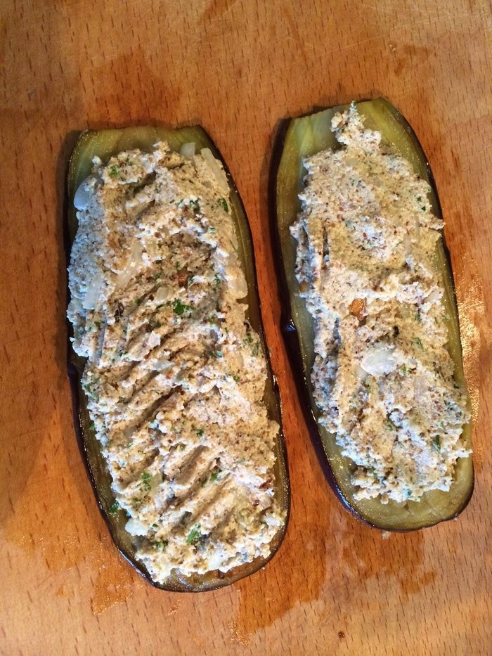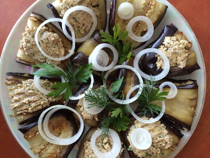 Теперь берем кусочки баклажана и выкладываем на них пасту сациви.