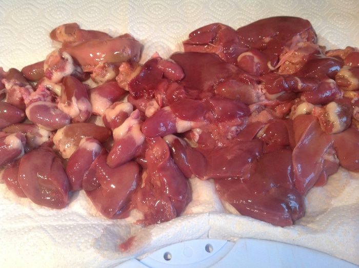 Куриную печень и сердечки промойте и высушите бумажным полотенцем. Печень нарежьте крупными кусочками.