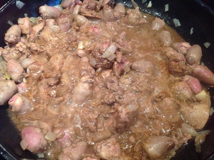 На сковороде с толстым дном обжарьте лук, чеснок, добавьте субпродукты и обжарьте до появления золотистой корочки.
