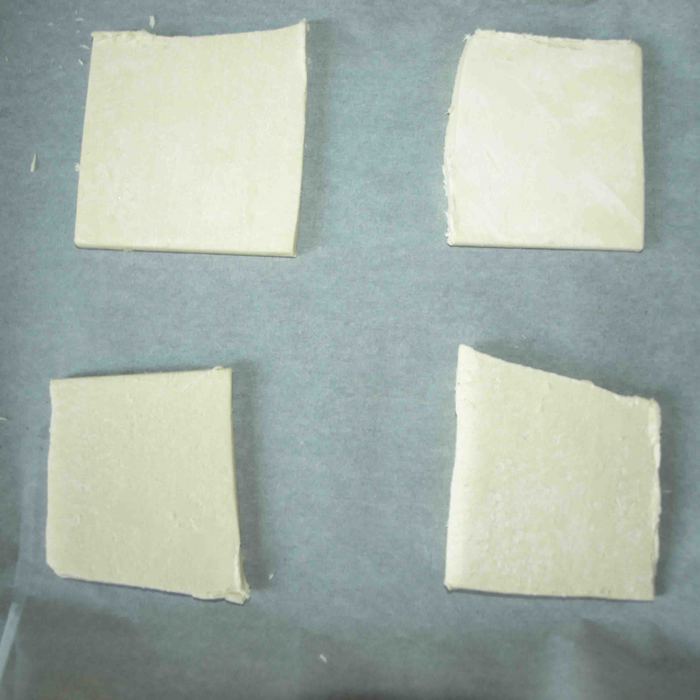 Тесто слегка разморозить, нарезать на 4 части. Отправить на выстеленный бумагой противень и поставить в холодную духовку. Включить духовку на 180 градусов.