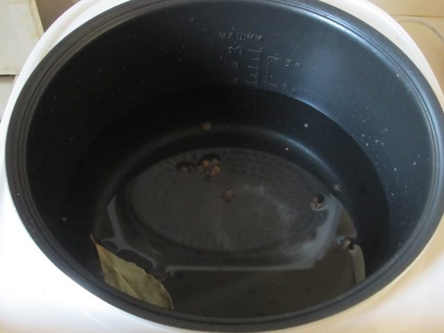 В чашу мультиварки налить воду. Посолить, добавить лавровый лист, черный и душистый перец горошком.