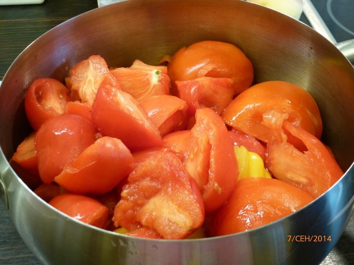 Спелые помидоры моем и нарезаем крупными дольками в кастрюлю. Я каждый помидор делила на 4 части.