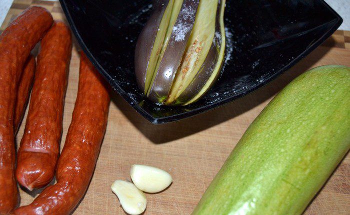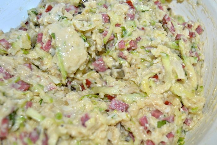 Колбаски мелко нарезать,если у вас острые,то уменьшайте количество соли и перца.Кабачок натереть на крупной терке.