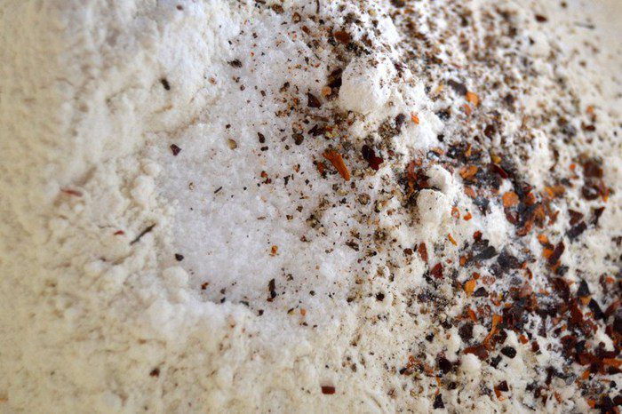 Муку просеять,добавить разрыхлитель,соль,перец,у меня еще добавлен перец разновидность чили"гуахильо"