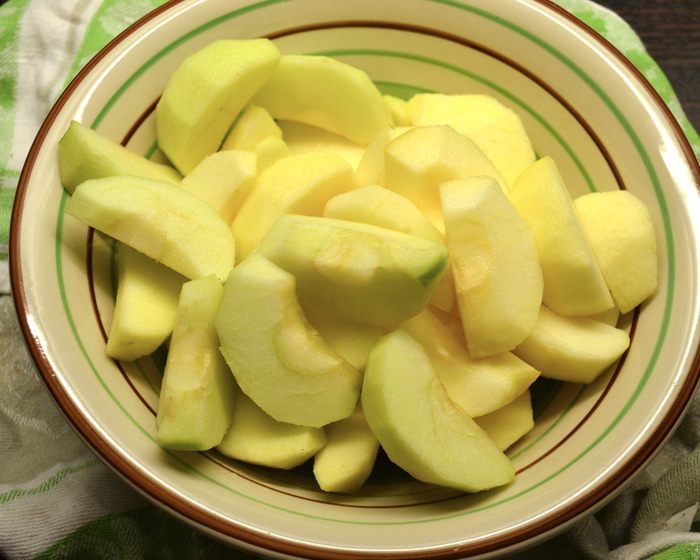 Яблоки нарезать достаточно крупно, если яблоки некрупные (как у меня), то просто на четвертинки. По желанию можно залить их ромом (заранее) и оставить постоять. Учитывая, что я готовила пирог детям, я не стала заливать яблочки! Они все равно получились необыкновенно вкусными в этом бисквите!!!......