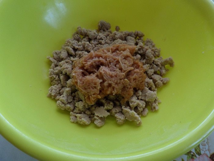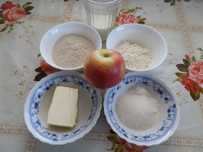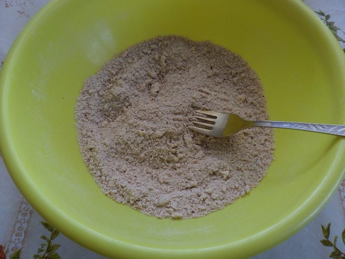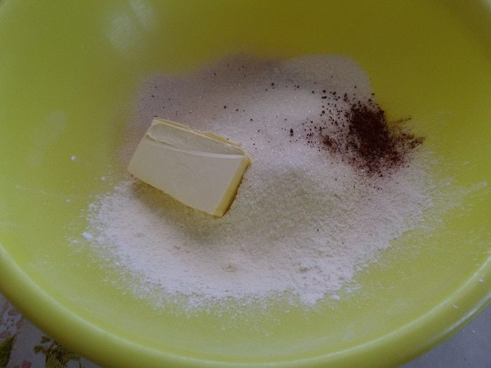 В чашку просеиваем оба вида муки. Добавляем сахар, разрыхлитель, корицу (по вкусу) и сливочное масло.