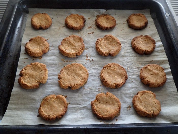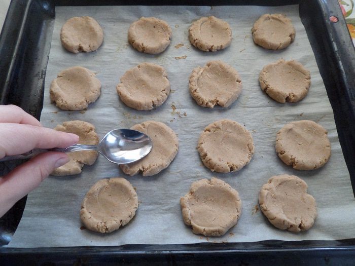 Тесто делим на кусочки. Придаем форму шариков. Выкладываем на противень и слегка прижимаем ложкой.