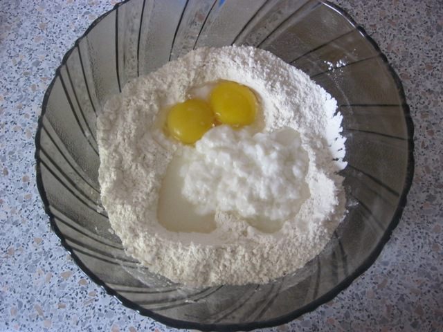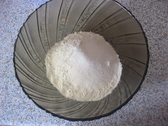Просеять муку в миску, добавить соль, соду, сахар.
