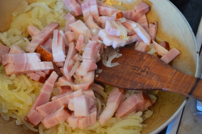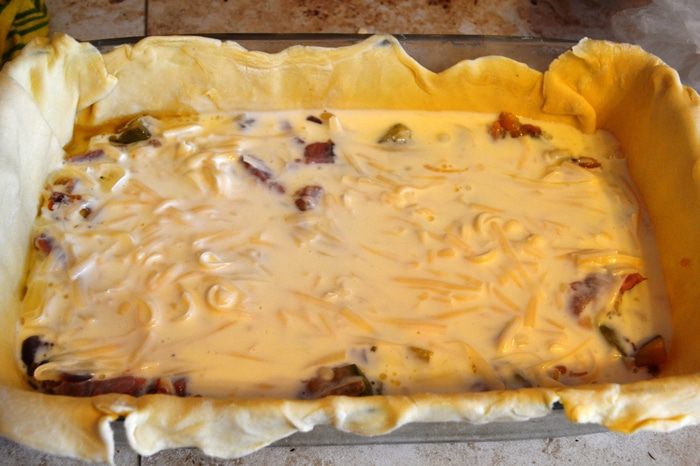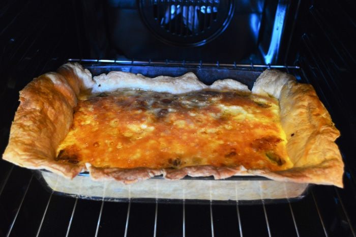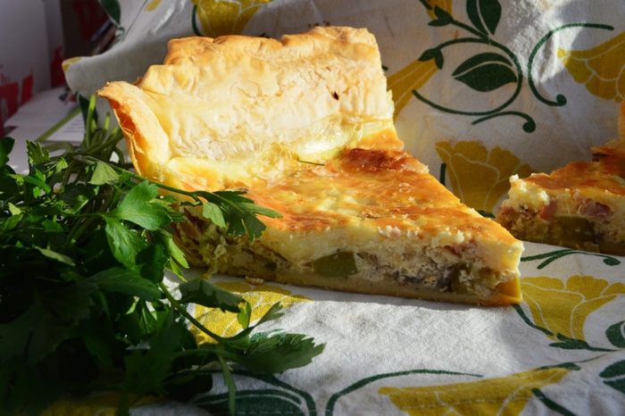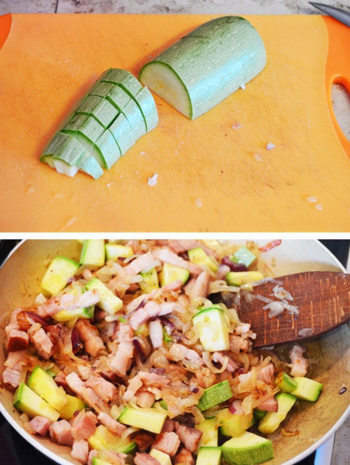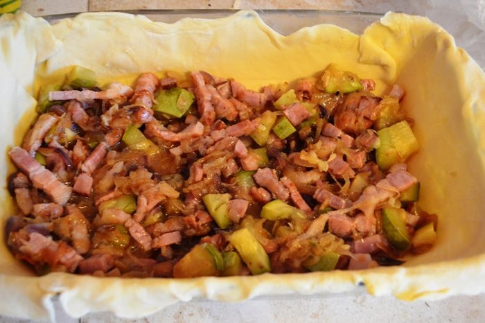 Превосходно подходит для сытного завтрака (для быстроты действий можно с вечера приготовить начинку). Можно каждые выходные радовать домачадцев новым пирогом, т.к. вариаций начинок уйма: лук-порей+ отварная куриная грудка; грудинка+шпинат; ветчина+сыр и т.д. Сегодня у меня сочный кабачок и грудинка! Прошу к столу!