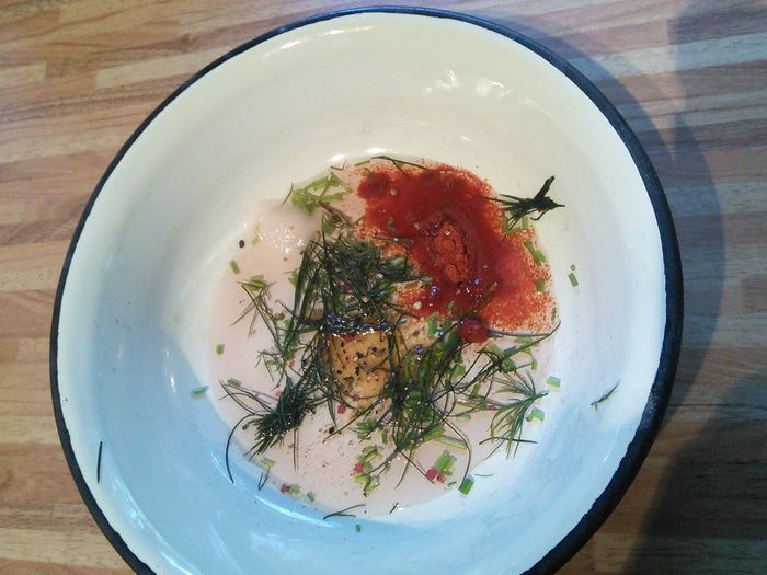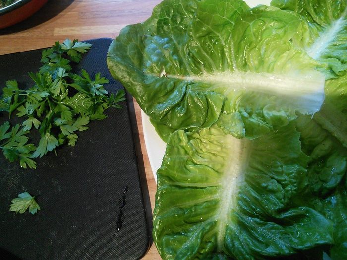 Для заправки уксус смешать с табаско, паприкой, солью, перцем. Оборвать листики с петрушки, шнитт-лук, укроп мелко порубить. Зелень добавить к заправке.