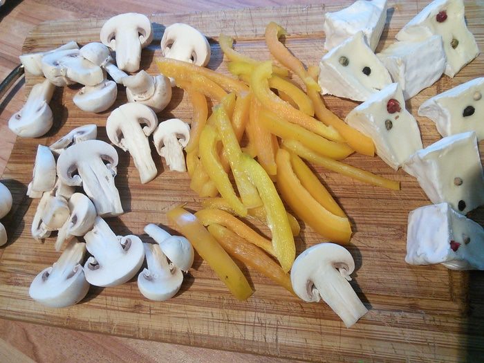 Сыр, в оригинале с зёрнами зеленого перца, нарезать на треугольники, перец соломкой, шампиньоны пополам, помидор кольцами.