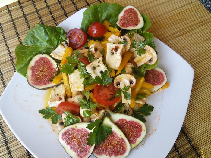 Хочу познакомить вас с вкусным осенним салатом. Ароматный камамбер выгодно сочетается со сладким инжиром, а нежный ореховый вкус шампиньонов (я использую сырые грибы, если они свежие, этого абсолютно не стоит бояться) перекликается с хрустящей паприка. Пусть всегда будет вкусно !