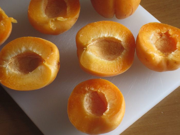 Выложить тесто в форму (диаметр 24 см) с пергаментом и разровнять поверхность.Сверху разложить половинки абрикосов срезом вверх и выпекать в разогретой до 180 ° С духовке 40 минут.