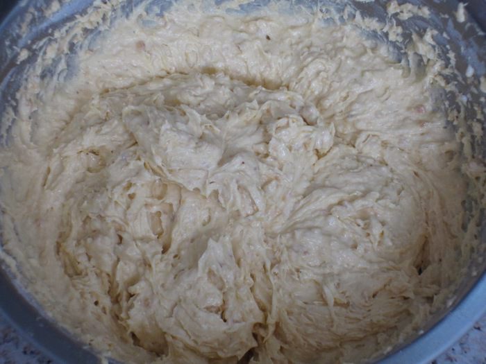 Сливочное масло комнатной температуры взбить с сахаром.Не прекращая взбивать,ввести яйца,добавить измельчённый фундук,муку с разрыхлителем.Взбивать до получения однородного теста.