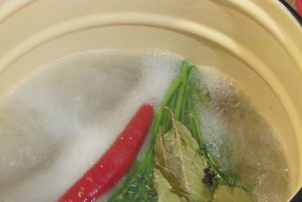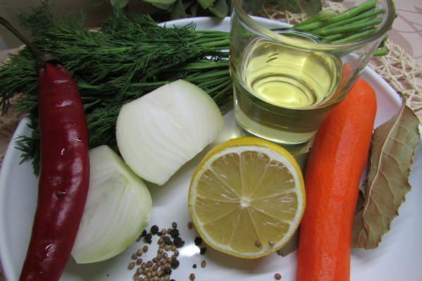 В кастрюлю налить воду, положить морковь, укроп, лук, нарезанный на несколько частей, красный горький перец, перец горошком, кориандр, лавровый лист, лимон, растительное масло, соль и довести до кипения.