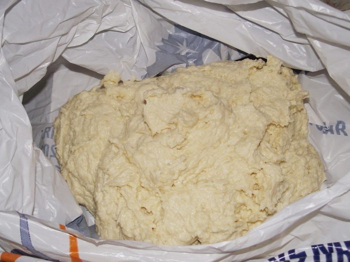 Замесить руками тесто, долго мешать нет необходимости, до однородности. Разделить его на две части, положить в холодильник на сутки. В процессе сода вступает в реакцию со сметаной, в результате чего пирог будет пышным и рассыпчатым.