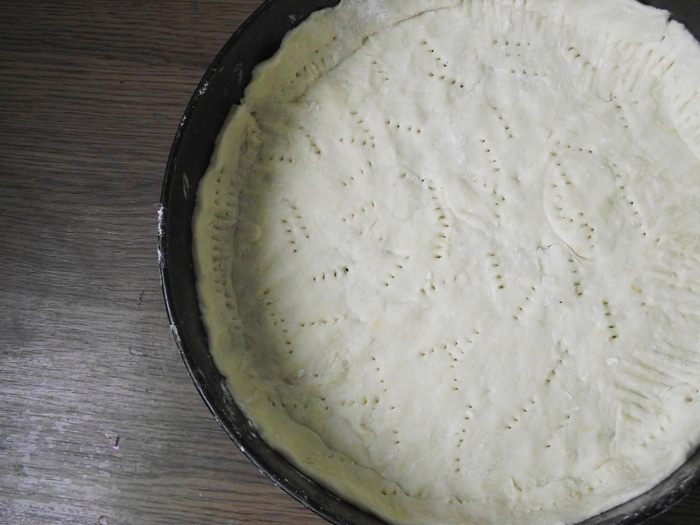 Духовку включить на 170 град. Тесто раскатать, добавляя небольшим количеством муки. Один лист выложить в форму и сделать проколы вилкой. Толщина листа примерно 2-3 см.