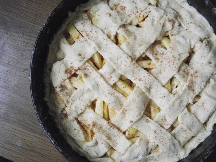 Вторую половину теста раскатать на столе, присыпав немного муки. Разрезать ножом на полоски и сформировать сетку. Накрыть яблочную начинку.