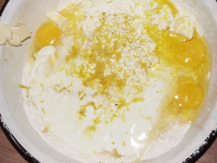В просеянную муку нарезаем маргарин. Перемешиваем в крошку, добавляем творог, сметану, яйца, соду гашеную, а также сахар-песок.