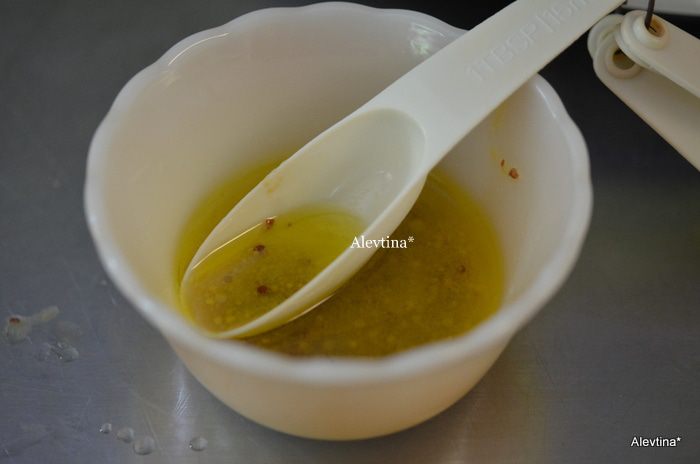 Приготовим заправку, смешав масло,винный белый уксус и горчицу цельнозерновую в емкости.