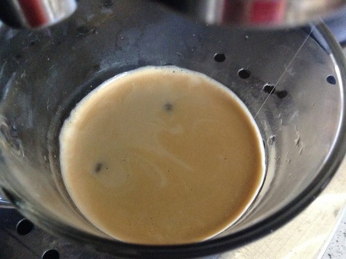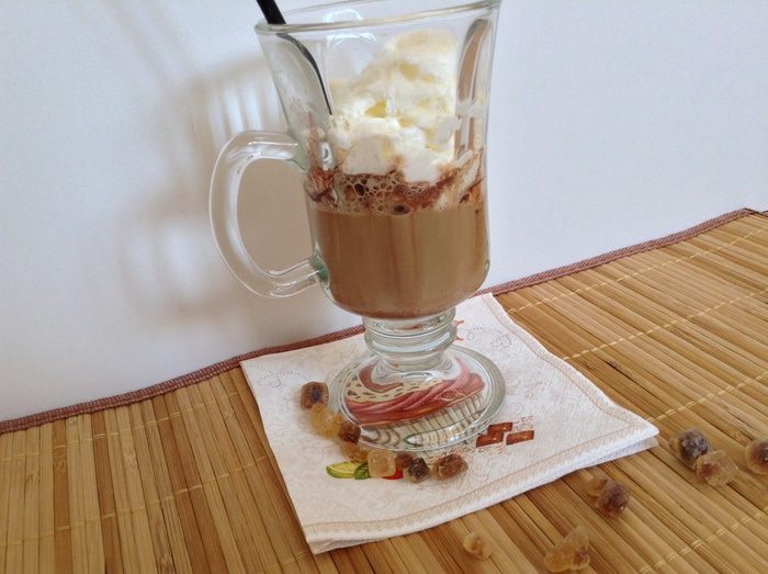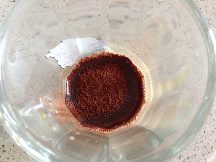Добавить кофе. Сверху кафе, при помощи ситечка для заваривания чая, присыпать какао.