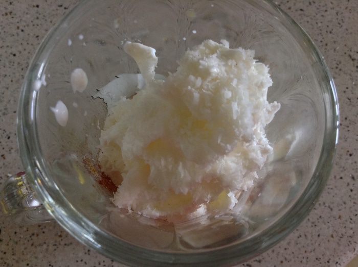 Добавить 2 столовые ложки взбитых сливок и присыпать кокосовой стружкой.