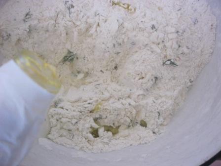 В миску просеять муку, добавить сахар, соль, соду, разрыхлитель, мелко порезанный укроп, натертый сыр, тмин ( по желанию). Перемешать. *Стакан - 250 гр