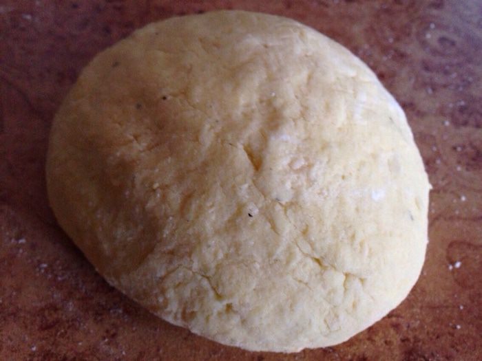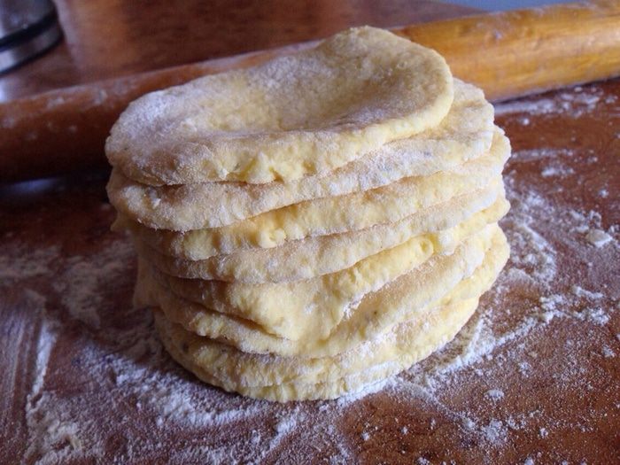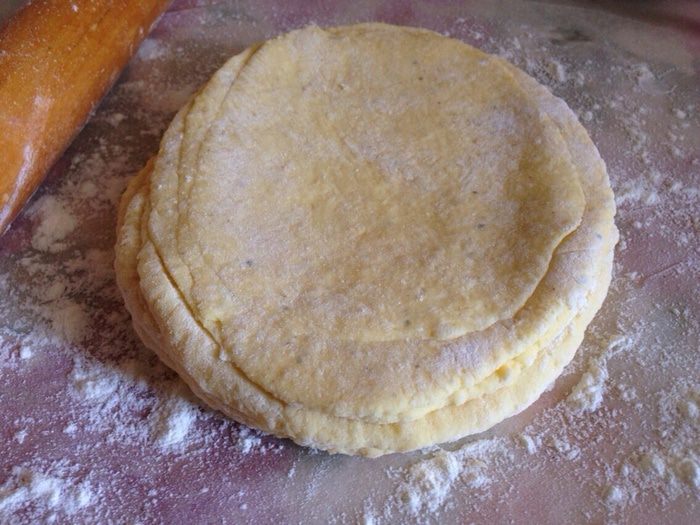 Каждую часть раскатать в небольшую лепёшку на поверхности слегка присыпанной мукой. Лепёшки уложить стопкой.