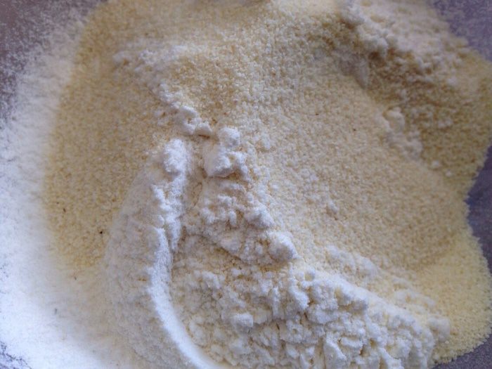 Просеять в миску муку и добавить манку.
