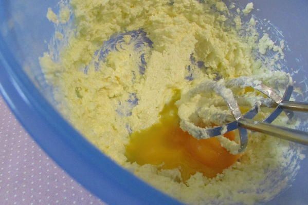 Продолжая взбивать, ввести яйца.