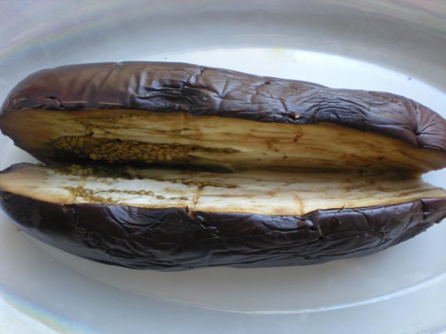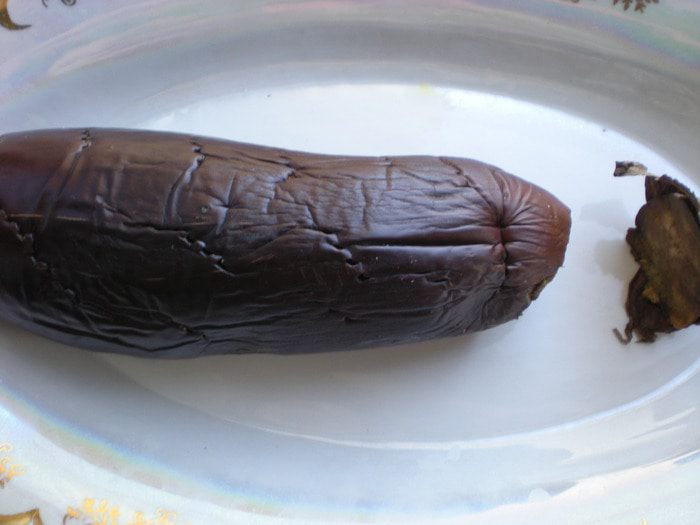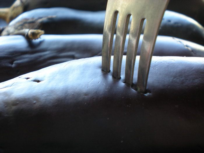 Разогреть духовку до 220*. Проколоть баклажаны вилкой со всех сторон.