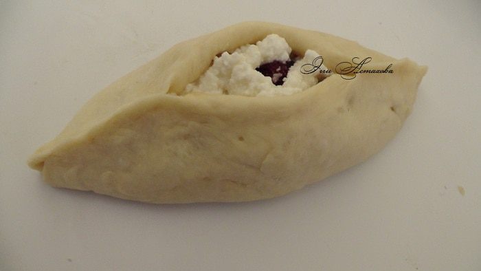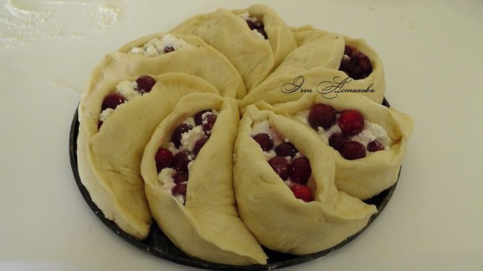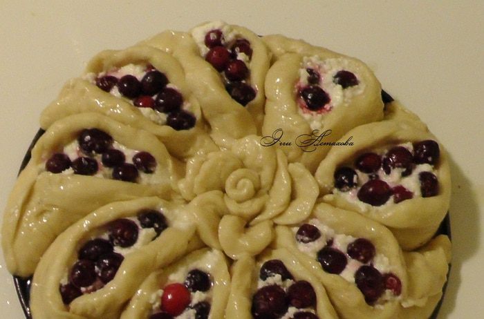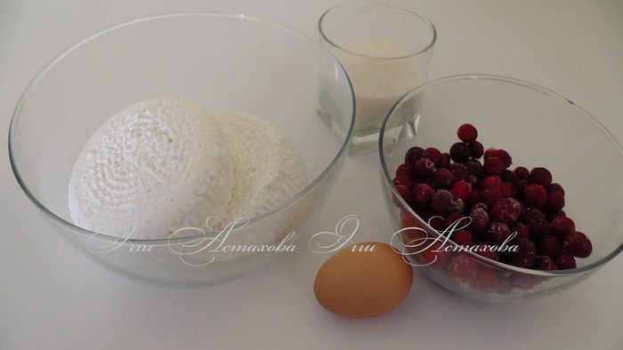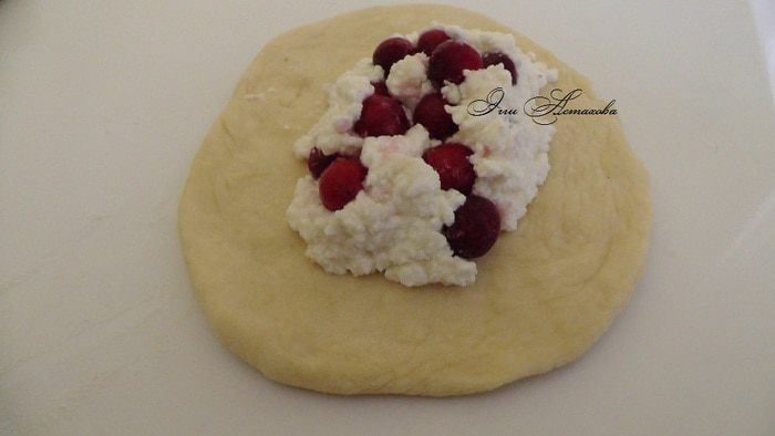 Смешиваю творог (я стараюсь брать творог домашний, когда нет такой возможно, выбираю творог, что бы он не был слишком мокрым, иначе в дальнейшем смешиваясь с клюквой, чтобы начинка не расползлась и не испортила внешний вид изделия) с взбитым яйцом, клюквой, крахмалом и сахаром. Все хорошо перемешиваю. Начинка готова!
