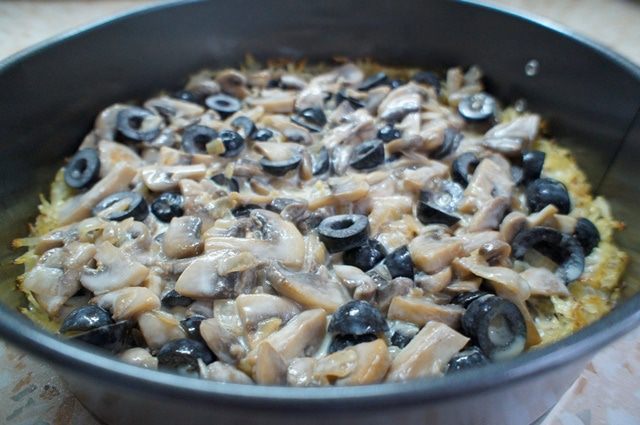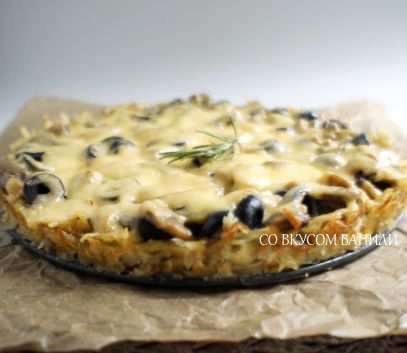 Предлагаю вам разнообразить приготовление обычной пиццы и попробовать пиццу на картофельной основе с начинкой из грибов, маслин и сыра.