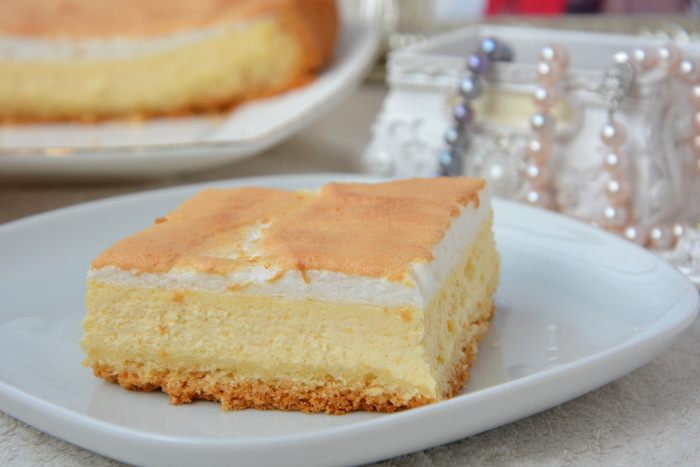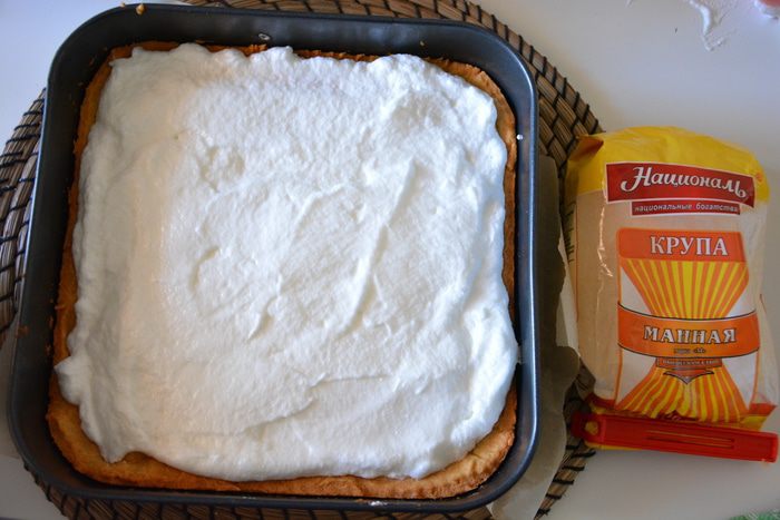 Выложить сверху взбитые белки, выпекать пирог при той же температуре еще 15 минут.