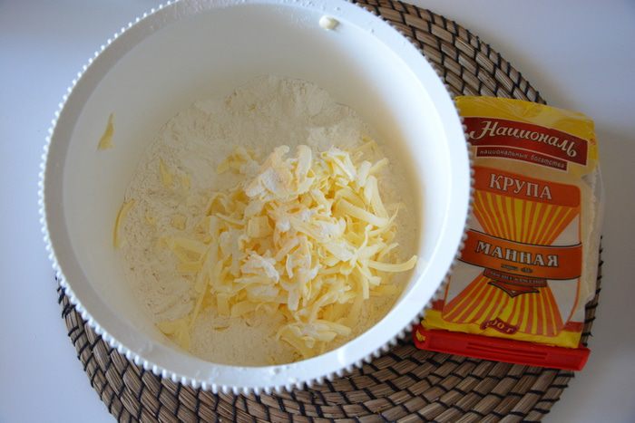 Сливочное масло положить в морозильник на 10 минут. Муку просеять с солью и разрыхлителем. Масло натереть на терке и смешать с мукой.